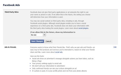 Để thay đổi tùy chọn tham gia quảng cáo trong thiết lập chế độ riêng tư của Facebook, hãy thực hiện các bước sau: Nhấn vào biểu tượng bánh xe ở góc trên bên phải màn hình chính của Facebook > chọn Privacy Settings > nhấn Ads trong danh sách bên trái > nhấn Edit của mục Ads & Friends ở phía phải. Sau đó, chọn "No one" trong trình đơn thả xuống và nhấn Save Changes để lưu lại. Việc chọn "No one" trong trình đơn thả xuống tương tự mục "Third Party Sites" ở phía trên để không tham gia vào chương trình quảng cáo của các hãng thứ 3.
